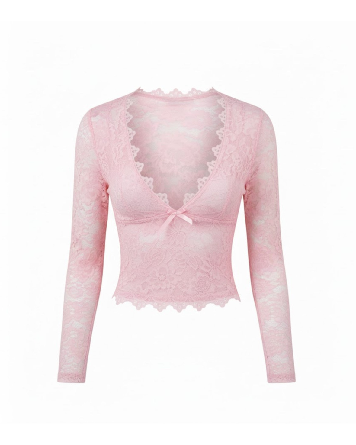 Details: Scalloped deep V neckline, long sleeves, and a romantic lace pattern